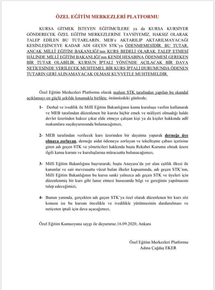 Değerli takipçiler, özel sektördeki öğretmen ihtiyacı sebebiyle uzman öğretici kursları yıllardır açılmaktadır. Ancak bu sefer ilk defa uzaktan eğitim yöntemiyle açılacaktır. Yüz yüze 1 aylık bir kursun bile niteliğini tartışırken uzaktan eğitime onay vermek mümkün değildir. Uzaktan eğitimle herhangi bir konuda 1 günlük hizmet içi eğitimler yapılabilir ancak böyle bir sertifika programı asla kabul edilemez. Bu konuda ilgili mercilere itirazların yapılması gerekmektedir.