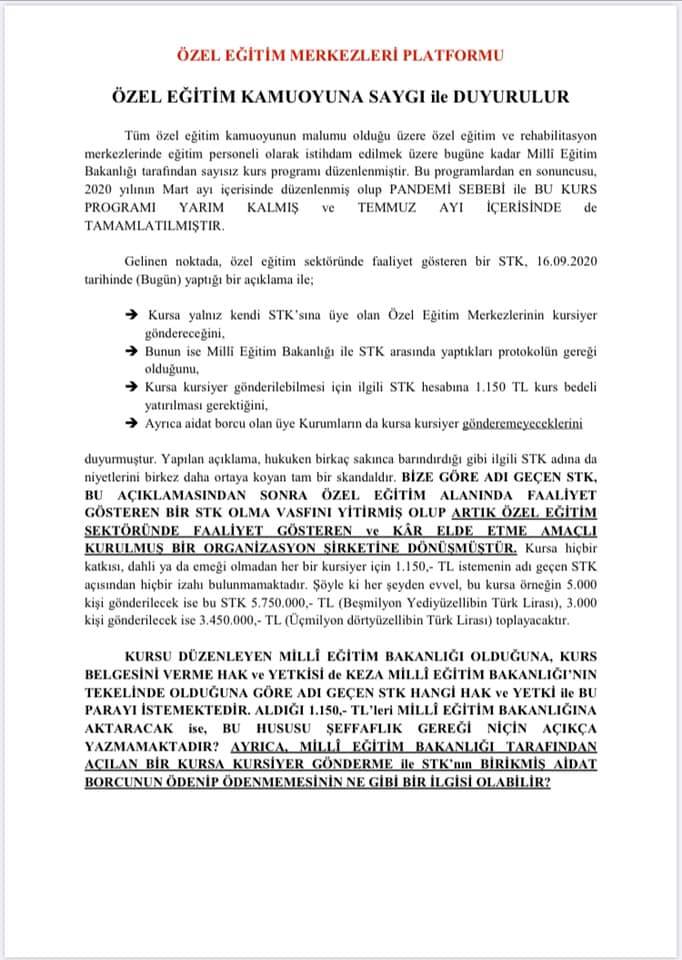 Özel Eğitim Merkezleri Platformunun İtirazları: