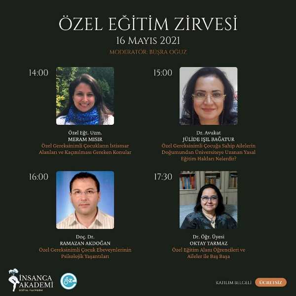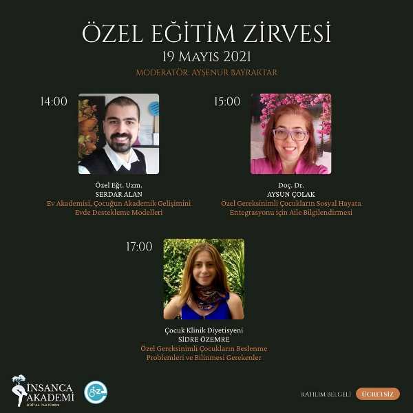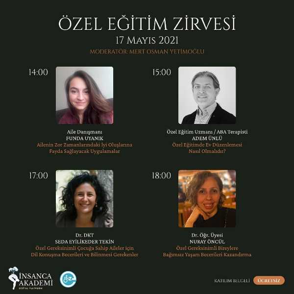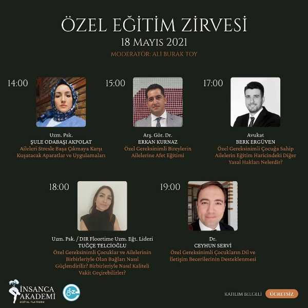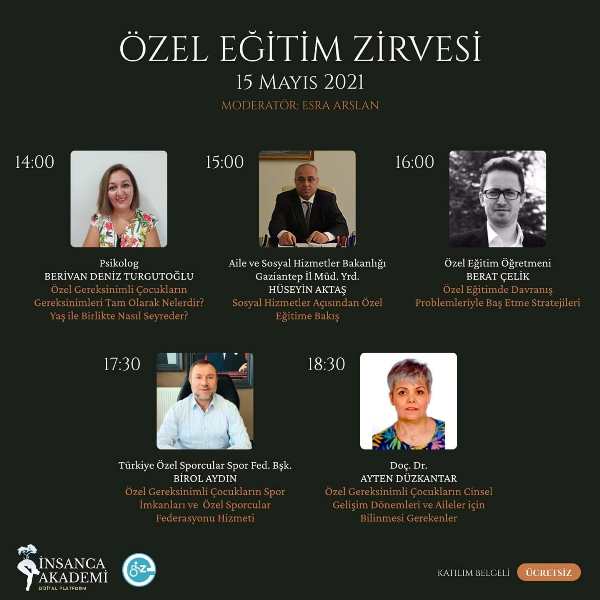 İnsanca Akademi ve Engelsiz Anadolu Kulübünün ortaklığı ile düzenlenen Özel Eğitim Zirvemize davetlisiniz. Projenin düzenlenmesinde emeği geçen tüm ekibe, birbirinden değerli 21 hocamıza, proje birimimize, birim koordinatörlerimize ve elbette paydaşımız Engelsiz Anadolu Kulübüne sonsuz teşekkürler.