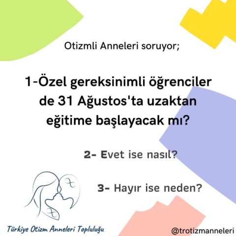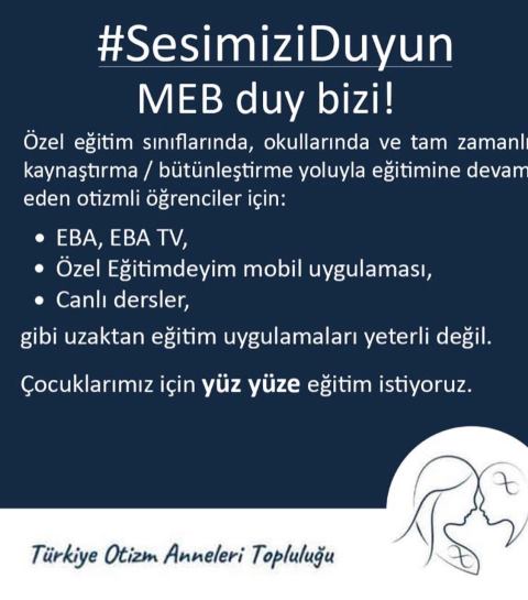 Türkiye Otizm Anneleri Topluluğu’ndan, Denizli Otizm Derneği İletişim Koordinatörü ve Otizmli Deniz’in annesi Dudu Karaman Dinç, salgın sürecinde engelli çocukların ailelerinin kendi kendilerine kaldıklarına dikkat çekiyor. Otizmli çocuklar için MEB’ in EBA uygulamasından verim alınamadığını belirten “Bizim çocuklarımız için uzaktan eğitim için uygun değil” diyor. Otizmli çocuklar için eğitimin bireysel ve yüz yüze olması gerektiğini vurgulayan Dinç, alışveriş merkezleri dahil her yerin açık olması nedeniyle, gerekli düzenlemelerin yapılarak bu okulların da açılıyor olmasını, Otizmli Anneler grubu adına talep ettiklerini belirtiyor.
